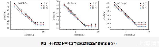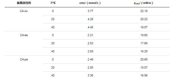 總體而言,溫度對甜菜堿氟碳表面活性劑的cmc影響較小。此外,在0~40℃的溫度范圍內(nèi),對比三種表面活性劑的表面活性參數(shù)可知,cmc值均小于4.45 mmol/L,γcmc均小于22.19 mN/m。親水端官能團的不同對表面活性劑的性能具有一定的影響,當溶液濃度足夠大時,C4-Ac的表面張力相對較高,C4-sa和C4-pa具有較低的表面張力,后者略高于前者,并且C4-sa和C4-pa的cmc值低于C4-Ac。因為從分子結(jié)構(gòu)上來看,C4-Ac比C4-sa和C4-pa少一個有效碳,因此前者的疏水性要略弱于后二者,可以解釋表面張力和cmc的相對大小。