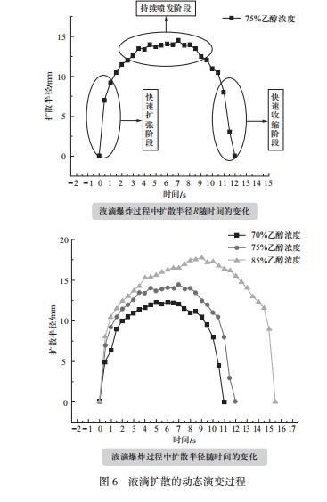 實驗1探究液滴擴散的動態(tài)演變過程就是將前文用文字性描述的液滴擴散現(xiàn)象定量處理,用數(shù)據(jù)清晰的看出液滴爆炸過程中擴散半徑隨時間的變化,如圖6所示,可以從折線圖中直觀看出液滴爆炸的三個過程。