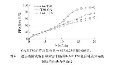 圖4逐層吸附或混合吸附法制備的GA和T80復(fù)合乳液體系的脂肪消化動(dòng)力學(xué)曲線