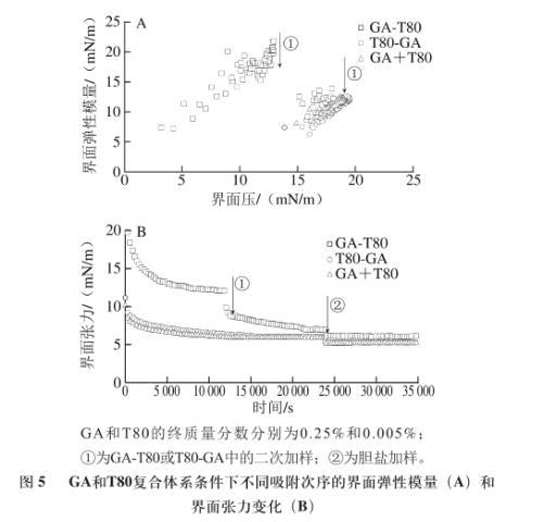 圖5 GA和T80復(fù)合體系條件下不同吸附次序的界面彈性模量(A)和界面張力變化(B)