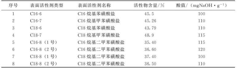 石油磺酸鹽具有降低油水界面張力、來源廣和價格低等優(yōu)勢,因而在三次采油中占有極其重要的地位。但同時由于它的未磺化油含量較高,造成低滲透油層的注入困難。烷基苯磺酸鹽是一種碳鏈長度固定、結(jié)構(gòu)相對單一的表面活性劑,其未磺化油含量相對較低,遠遠小于石油磺酸鹽。筆者通過配制弱堿三元復(fù)合體系評價其界面活性,試驗研究了烷基苯磺酸鹽結(jié)構(gòu)與界面活性的關(guān)系,旨在為弱堿三元復(fù)合驅(qū)優(yōu)選表面活性劑提供重要依據(jù)。