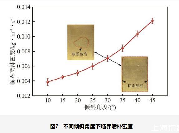 從圖7中可以看出,在較低的傾斜角度(如10°~25°)下,液膜受重力在壁面平行方向分量的影響較小,主要依靠噴淋液體的動能和潤濕性來維持覆蓋。此時,液膜較厚,表面張力對毛細波動的抑制作用較強,能夠有效抵御擾動,流動較為穩(wěn)定,因此臨界噴淋密度較低。然而,在較高的傾斜角度(如30°~45°)下,重力在流動方向的分量顯著增強,液膜受到更大的重力驅動力作用,易發(fā)生滑移和局部脫離壁面現象。同時,傾斜角度增大會使液膜變薄,液膜內剪切力增大,進一步放大表面張力波動對擾動的響應,從而導致液膜對擾動的敏感性提高,流動不穩(wěn)定性顯著增強。此外,局部區(qū)域的液膜破裂會導致液膜整體失穩(wěn),最終在兩側形成穩(wěn)定細流。因此,為了維持液膜的完整性和連續(xù)性,需要提高噴淋密度以抵消重力和表面張力波動的破壞作用,從而導致臨界噴淋密度在高傾斜角度下顯著升高。
