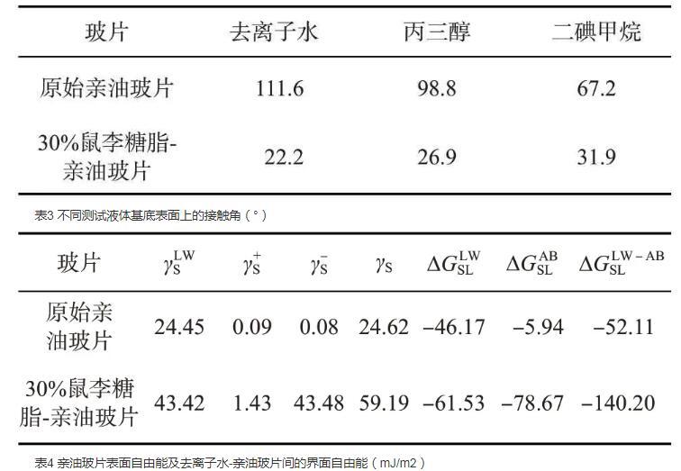 原油開采及運移過程中,巖石表面潤濕性對提高采收率十分重要,而巖石表面自由能變化是研究其潤濕性改變的基礎,也是其他物質(zhì)與巖石間相互作用的具體體現(xiàn)。本研究主要采用去離子水(Lewis酸堿呈中性)、丙三醇(極性液體)及二碘甲烷(非極性液體)作為檢測液體原始親油玻片及30%鼠李糖脂溶液處理后的親油玻片,計算固體表面自由能,結果見表3和表4。由不同測試液體基底表面上的接觸角(表3)可見,無論何種測試液體體系,經(jīng)過30%鼠李糖脂溶液的作用,親油玻片的水濕性顯著提升,尤其是在去離子水中。兩種親油玻片表面的自由能及去離子水-親油玻片間的液-固界面自由能見表4。經(jīng)30%鼠李糖脂溶液處理后,親油玻片表面的水相潤濕角顯著下降,導致原始親油玻片的固體表面能γS僅為24.62 mJ/m2,而30%鼠李糖脂-親油玻片的γS卻達到59.19 mJ/m2,為原始親油玻片的1.5倍。此外,基于Young公式和DLVO擴展理論及式(5)—式(7)分析,兩種條件下的親油玻片與去離子水間總存在吸引力,在原始親油玻片與去離子水間的界面相互作用能中,Lifshitz-van der Waals分量更大,說明其界面間主要依靠van der Waals相互作用;而在30%鼠李糖脂溶液作用后的親油玻片與去離子水間作用能中,Lifshitz-van der Waals作用和Lewis酸堿相互作用均存在,因此30%鼠李糖脂-親油玻片與去離子水間的ΔGLW-ABSL更低。自由能越低說明熱力學更穩(wěn)定,因此相較于原始親油玻片來說,水更易在鼠李糖脂處理后的親油玻片表面吸附。由此可以推測,鼠李糖脂在界面比原油極性分子展現(xiàn)出更強的競爭吸附能力,可將吸附在巖石表面的原油分子脫附,最終改變儲層潤濕性。