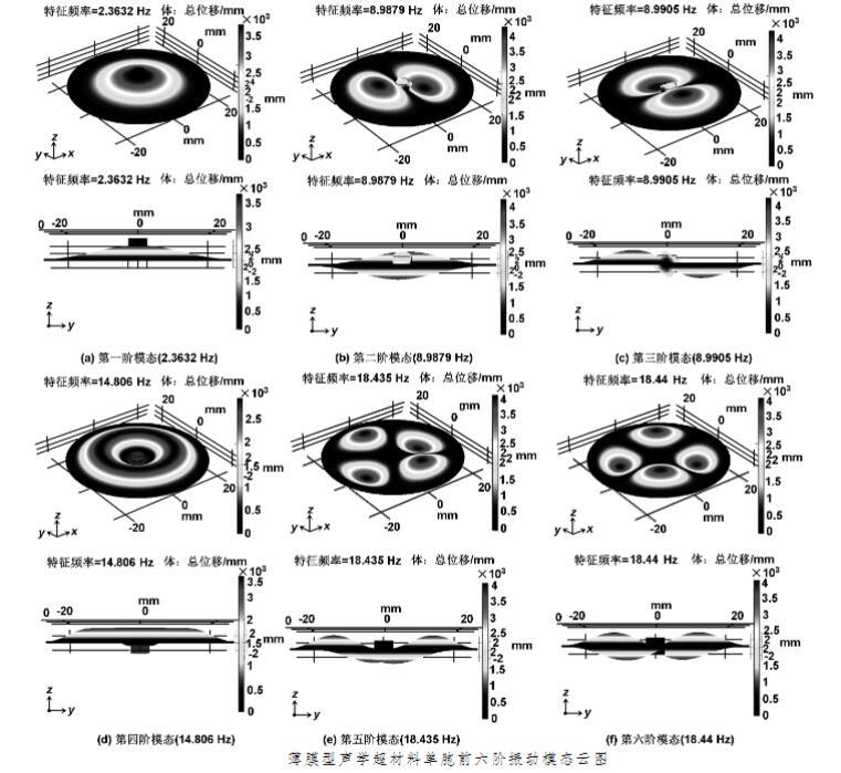 考慮聲波對薄膜的影響,在聲場仿真前進(jìn)行模態(tài)分析以研究其在特定頻段聲波下的響應(yīng)形態(tài)。使用COMSOL建立MAMs單胞模型進(jìn)行模態(tài)仿真。