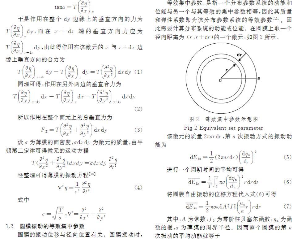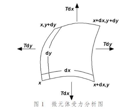 分析薄膜振動需進(jìn)行受力分析。薄膜所受內(nèi)力僅為張力。設(shè)單位長度薄膜張力為T(N/m),單位面積質(zhì)量為ρ。取薄膜平衡位置在xy平面內(nèi)的微元體分析(圖1),當(dāng)其受到垂直xy面的外力擾動后,會在張力T作用下產(chǎn)生橫向振動,恢復(fù)力主要為張力。