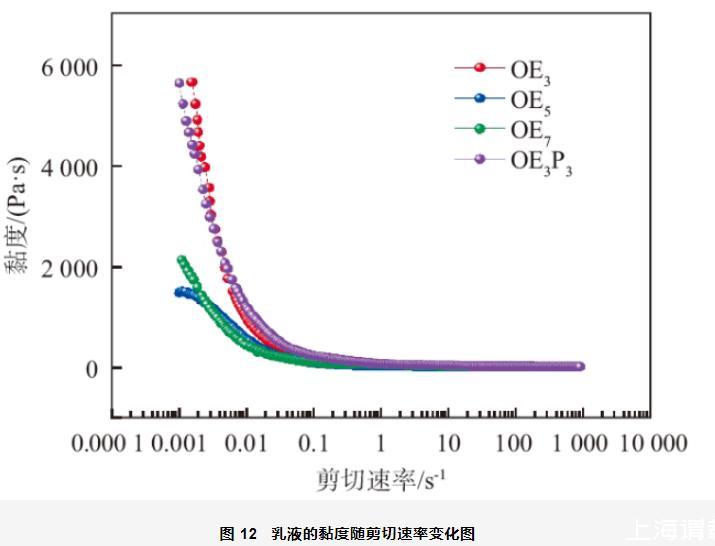 圖12為乳液的黏度隨剪切速率的變化圖。從圖中可以看出,4種乳液的黏度隨著剪切速率的增大而逐漸下降,說明這些乳液都呈現(xiàn)出剪切變稀體系;隨著剪切速率的繼續(xù)增加,其黏度不再下降而呈現(xiàn)一恒定值。這是因?yàn)檫@些乳液都形成了層狀液晶相,在外力剪切作用下,液晶的結(jié)構(gòu)極易被破壞,其微觀結(jié)構(gòu)單元會隨著剪切速率的增大而調(diào)整方向,當(dāng)體系內(nèi)微觀結(jié)構(gòu)單元的取向與剪切方向一致或者平行,就會導(dǎo)致體系黏度的下降;繼續(xù)增大剪切速率,液晶內(nèi)部微觀結(jié)構(gòu)單元取向基本都與剪切方向保持一致或平行,其黏度不再變化。從圖中還可以看出,當(dāng)剪切速率較低時,以O(shè)E3和OE3P3為乳化劑制備的乳液的黏度幾乎是以O(shè)E5和OE7為乳化劑制備的乳液黏度的3倍,這可能是因?yàn)榍罢咝纬傻氖恰榜R耳他十字”花紋的液晶結(jié)構(gòu),而后者是纖維狀的液晶結(jié)構(gòu)。4種乳液良好的剪切變稀特性使其在儲存期間保持較高的黏度,而在較高的剪切速率下又具有良好的流動性,便于生產(chǎn)和使用。