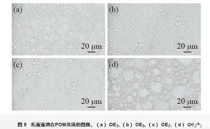 圖9(a)~(d)為分別以O(shè)E3、OE5、OE7和OE3P3為乳化劑制備的乳液液滴在POM亮場的圖像,可以發(fā)現(xiàn)球形液滴分散在連續(xù)的水相中,且以O(shè)E3為乳化劑形成的乳液具有均勻、細(xì)小的液滴。通過測定乳液液滴的粒徑分布可知,分別以O(shè)E3、OE5、OE7和OE3P3為乳化劑形成的乳液液滴的平均粒徑為3.65,3.95,4.66和15.34μm,即隨著OEn中EO加合數(shù)的增加,乳液粒徑的尺寸逐漸增大,且當(dāng)在OE3中引入PO基團(tuán)后,乳液的粒徑明顯增大且達(dá)到最大值。這可能是因?yàn)樵谌橐旱男纬蛇^程中,油醇烷氧基化物表面活性劑分子在油/水界面定向排列可以增加液體石蠟在水中的分散性,使得液體石蠟油滴均勻分散在水中,形成細(xì)小的液滴,且表面活性劑分子定向排列形成的乳化膜可以防止乳液液滴聚并,從而可以使乳液保持較小的粒徑。但隨著油醇烷氧基化物分子結(jié)構(gòu)中卷曲的EO鏈增長和支化的PO鏈的引入使得其在油/水界面的排列結(jié)構(gòu)不夠緊密導(dǎo)致乳液粒徑變大。