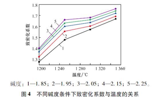 圖4不同堿度條件下致密化系數(shù)與溫度的關(guān)系