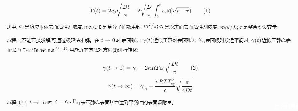 表面活性劑是一種能夠在界面吸附,降低界面張力的物質(zhì)。在界面快速形成過程中,如紡織品、紙和其他基質(zhì)的快速潤濕,液體的發(fā)泡,用靜態(tài)(平衡)表面張力不能全面表征表面活性劑快速降低界面張力的能力,而動態(tài)表面張力能更好地表征表面活性劑在上述過程中所起的作用。1946年Word和Tordai研究陰離子表面活性劑的界面吸附行為,提出了描述氣/液界面吸附量隨吸附時間變化的Word-Tordai方程;隨著各種檢測手段的開發(fā)應用,20世紀90年代起,關于表面活性劑的動態(tài)表面張力及其在氣/液界面吸附行為又引起該領域研究者的關注。Eastoe和Dalton通過研究雙子型非離子表面活性劑在空氣——水界面的吸附機理,驗證了Word和Tordai提出的擴散控制吸附和混合動力控制吸附模型適用于該體系。柴金玲等利用Word-Tordai方程得到烷基聚葡糖苷(APG)在不同濃度、溫度時的擴散系數(shù)和表觀擴散系數(shù),并發(fā)現(xiàn)鹽對吸附行為有明顯影響;劉杰等通過Rosen模型研究膠束對APG的動態(tài)表面張力的影響,發(fā)現(xiàn)各項參數(shù)的變化趨勢不會因為膠束的形成而受到影響。