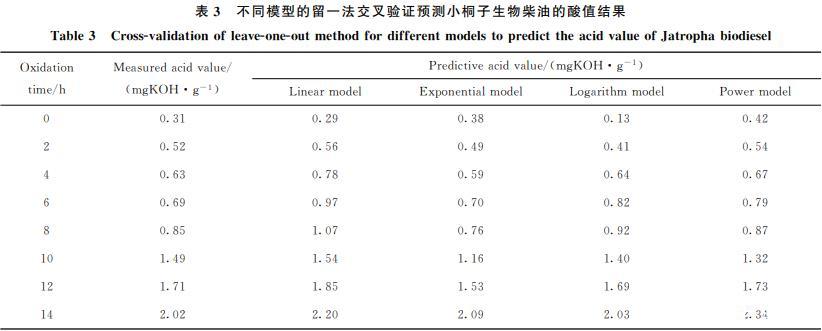 留一法交叉驗證是建立預測模型的一種常用方法,從N個觀測數(shù)據(jù)中選擇一個觀測數(shù)據(jù)作為驗證數(shù)據(jù),然后使用剩下的(N-1)個觀測數(shù)據(jù)擬合一個模型,并用驗證數(shù)據(jù)來驗證模型的精度,如此重復N次??紤]到數(shù)據(jù)量以及相關(guān)性,筆者利用Excel建立了線性、指數(shù)、對數(shù)、乘冪4種預測模型,對小桐子生物柴油酸值的預測結(jié)果見表3。