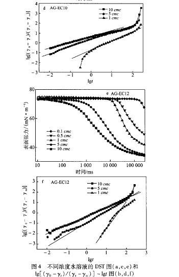 在25cc下測(cè)定不同濃度AG.EC水溶液的DST,并利用Rosen模型處理,得到其動(dòng)態(tài)表面張力參數(shù),見圖4、表1。