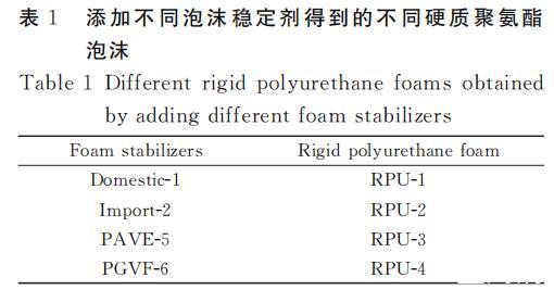 根據(jù)傳統(tǒng)制備工藝制備硬質(zhì)聚氨酯泡沫,分別把添加國產(chǎn)-1、進口-2、PAVE-5和PGVF-6泡沫穩(wěn)定劑得到的硬質(zhì)聚氨酯泡沫命名為RPU-1、RPU-2、RPU-3、RPU-4。