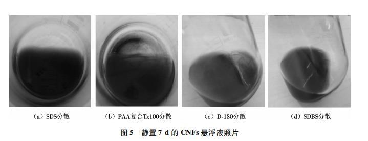 圖5為靜置7d后4種表面活性劑分散的CNFs懸浮液的狀態(tài).可以看出,采用SDS分散的CNFs懸浮液中未見明顯沉淀,SDBS分散的懸浮液中稍有沉淀,PAA復(fù)合Tx100分散的懸浮液和D-180分散的懸浮液中均能觀察到明顯的黑色沉淀物.