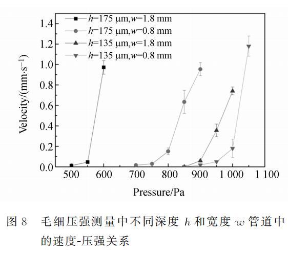 PDMS微管道采用軟光刻工藝制作。PDMS結(jié)構(gòu)層從模具揭下后,倒過來粘接在基底上,管道裸露朝上,形成開放管道。然后用壓敏膠(ARclad IS-7876,Adhesives Research.Inc.)將棚網(wǎng)粘接到開放管道上。制作的微管道寬分別為0.8~mm和1.8~mm,深75mu m和115mu m,長3cm和4cm。壓敏膠厚約60mu m,最終得到的開放管道高度約135μm和175μm。
