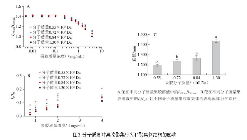 如圖3B所示,在任意高于臨界聚集濃度的條件下,芘的IE/IM隨果膠分子質(zhì)量的增加呈現(xiàn)規(guī)律性降低。這與果膠形成聚集體內(nèi)的疏水微區(qū)結(jié)構(gòu)有關(guān)。雖然高分子質(zhì)量果膠形成的聚集體具有極性更低、對芘溶解度更高的疏水微區(qū),但由于疏水微區(qū)尺寸較大,降低了芘分子間的接觸概率,從而減少了芘二聚體的生成,最終表現(xiàn)為較低的IE/IM。