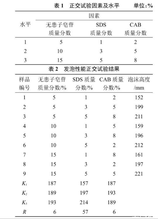 以發(fā)泡體系的復配組分(無患子皂苷、SDS、CAB 3種表面活性劑)為考察的3個因素,根據(jù)3種表面活性劑的發(fā)泡性能,每個因素選3個水平,選用L9(33)正交試驗設計優(yōu)化泡沫滅火劑的配方,正交表設計如表1所示。