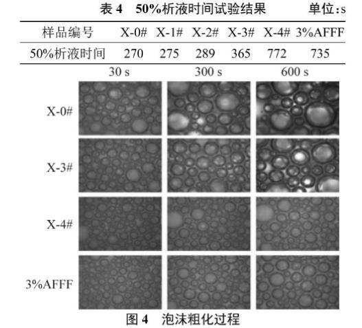 泡沫的穩(wěn)定性主要由泡沫的排水、粗化和聚并等多因素決定[10]。雙注射器技術產生的6種泡沫的圖像見圖3,而6種泡沫的50%析液時間測定結果見表4。這6種泡沫在0 s時有相同的初始體積,在重力作用下發(fā)生泡沫排水現(xiàn)象,600 s后6種泡沫的排水體積之間存在很大的差異,X-0#、X-1#和X-2#樣品泡沫排水量幾乎達到發(fā)泡前泡沫溶液的初始體積,X-3#泡沫排水量明顯降低,X-4#泡沫的排水體積較3%AFFF的排水體積少。以上結果表明添加質量分數(shù)0.30%的XG能很好地減緩泡沫排水,使無氟泡沫和商用泡沫滅火劑有相當?shù)呐菽€(wěn)定性。