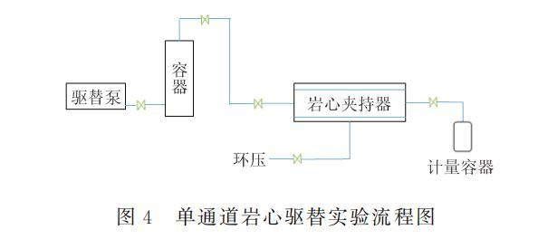 將3塊巖心抽真空后,飽和原油,根據飽和油的體積計算巖心孔隙度;將飽和好油的巖心在地層溫度下恒溫放置48h;使用標準鹽水進行水驅油,采出液含水率達到98%以上時停止,然后在地層溫度(30℃)下分別使用配制的CAO、CCAO和FHQ-I繼續(xù)以0.5PV的體積驅油,接著水驅直至含水率達到98%,計算出油體積,記錄驅替過程中壓力變化及采出液中的含油量,計算各階段采收率,結果見表6,驅替實驗流程如圖4所示。