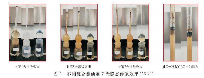 從以上分析來看,降黏增滲型驅油劑(CCAO和CAO)在靜態(tài)滲吸過程中通過降低原油黏度,提高了巖心原油的流動性及滲吸能力,其中CCAO滿足中黏原油滲吸驅油要求,靜態(tài)洗油率達到15.27%,且析出的原油不乳化,在實際生產過程中無需后續(xù)的破乳處理。