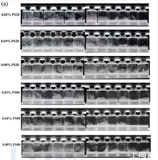 研究結(jié)果顯示,表面活性劑濃度越高,表面張力降低越明顯。比較兩種常用表面活性劑,PS20降低表面張力的效果比PS80更強(qiáng)。