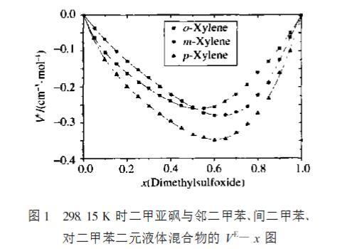 從圖1 可以看出,在298.15 K 時,二甲亞砜+鄰二甲苯、二甲亞砜+間二甲苯、二甲亞砜+對二甲苯共3 個二元混合物在全濃度范圍內(nèi)過量體積為負(fù)值,在最小值處大小順序?yàn)?鄰二甲苯>間二甲苯>對二甲苯。二甲亞砜是極性分子,存在 SO基團(tuán),是電子的受體;二甲苯分子中存在著大 π鍵,是電子授體,電子受體與電子授體之間形成 n -π配鍵,屬于弱化學(xué)作用,從而使他們組成的混合物體積收縮,過量體積呈現(xiàn)負(fù)偏差。