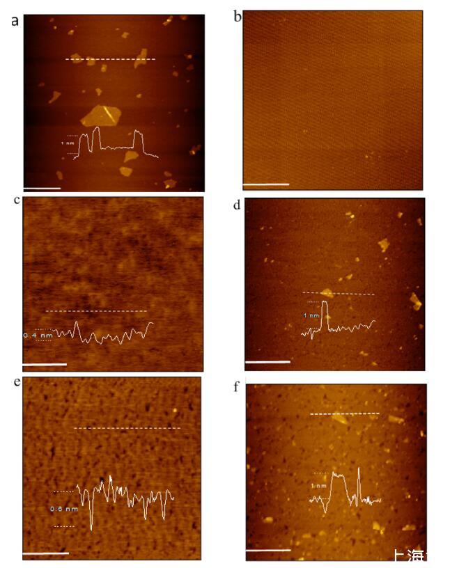 圖 5. 新鮮切割的云母表面上的 AFM 圖像(比例尺 = 1 μm):(a)干燥后的一滴 GO 分散體; (b) LB的對(duì)照實(shí)驗(yàn) 在空氣-GO 水界面沒有脂質(zhì)沉積的薄膜; (c) 從空氣-純水界面轉(zhuǎn)移的 DODAB LB 薄膜; (d) LB膜 從空氣-GO水界面轉(zhuǎn)移的DODAB; (e) 從空氣-純水界面轉(zhuǎn)移的 DSEPC LB 薄膜; (f) LB膜 DSEPC 從空氣-GO 水界面轉(zhuǎn)移。 所有脂質(zhì) LB 膜都在 20 mN/m 的恒定表面壓力下轉(zhuǎn)移。
