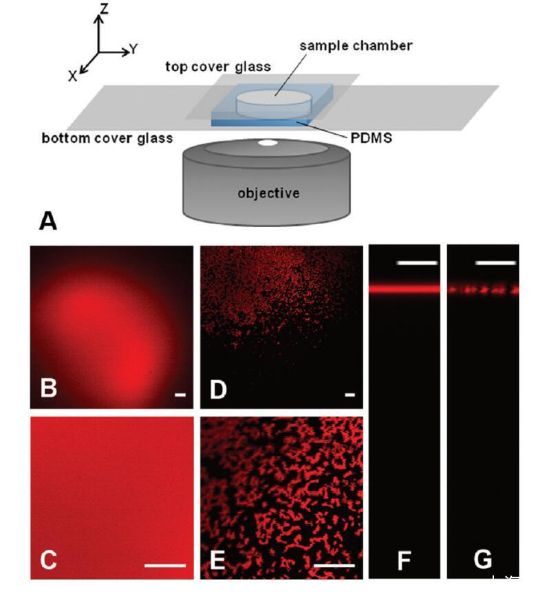 圖1。(A)樣品室和倒置顯微鏡設(shè)置。(B-G)在AWI條件下,pH 7.2,離子強(qiáng)度=193 mM的PBS中HSA-TR的共焦圖像。(B,C)HSA-TR(0.050 mg/mL)或(D,E)HSA-TR(0.025 mg/mL)的XY平面圖像。圖像C和E使用4倍光學(xué)變焦。穿過(guò)(F)HSA-TR(0.050 mg/mL)或(G)HSA-TR(0.025 mg/mL)AWI的XZ平面圖像。比例尺:20μm。