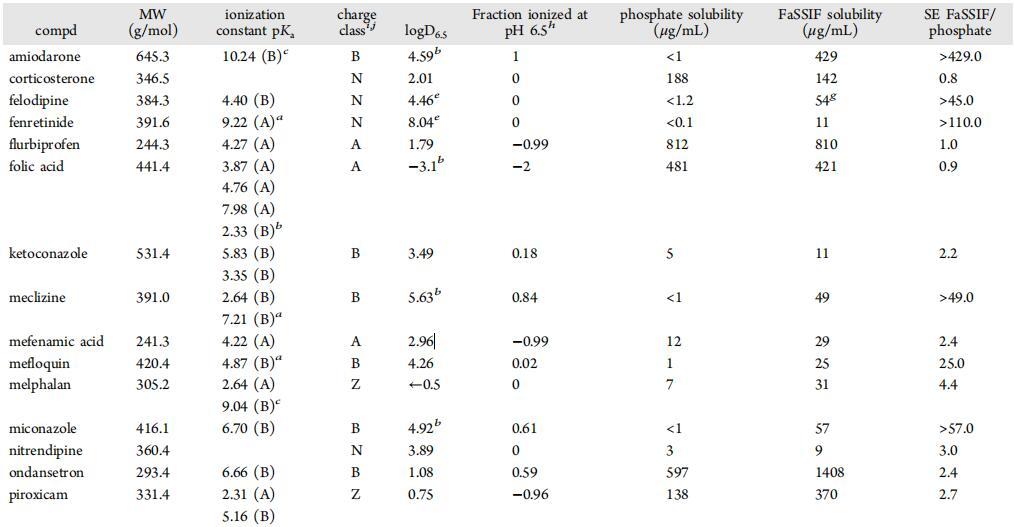 在FaSSIF和水性緩沖液中的溶解度評估和物理化學(xué)特性。選擇了一組21種上市藥物和30種來自不同研究項目的羅氏化合物,因為它們在pH值為6.5的水性緩沖液和FaSSIF介質(zhì)中的溶解度不同。作為標(biāo)準(zhǔn)做法,所有溶解度和表面壓力剖面測量均在室溫下進行,而不是在37°C下進行。盡管溫度可能會影響藥物溶解度、脂質(zhì)聚集體分配和溶解,據(jù)報道,?;悄懰崮z束的聚集數(shù)對溫度變化相對不敏感。19該化合物組包含不同的化學(xué)性質(zhì)、廣泛的親脂性,并涵蓋不同類型和程度的電荷狀態(tài),包括中性、酸性、堿性和兩性離子分子。表1列出了主要理化性質(zhì)和溶解度數(shù)據(jù)。