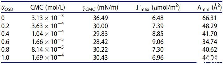 表4。25℃水溶液中不同摩爾分?jǐn)?shù)(αOSB)OSB/SDS體系的表面性質(zhì)。