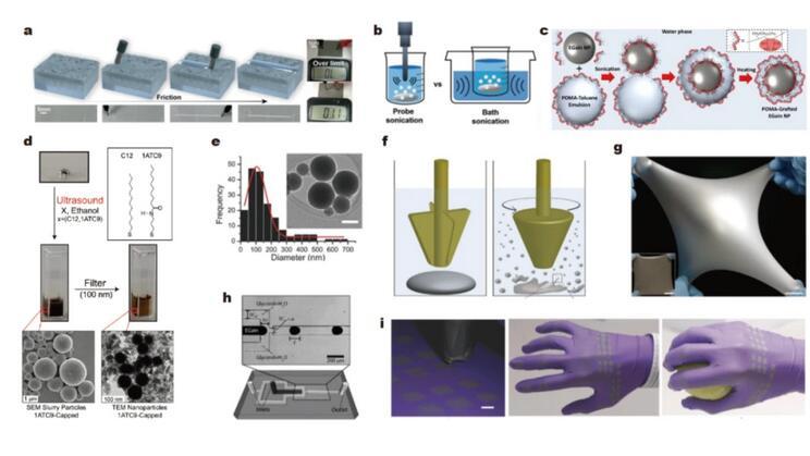 使用超聲和剪切等自上而下的方法將液態(tài)金屬從一個(gè)大的液滴分割成許多微米級(jí)或納米級(jí)的液滴,并保證其粒度分布相對(duì)均勻。氧化層或其他人工形成的表面修飾將暫時(shí)阻止液滴的重新結(jié)合??衫祀娮釉O(shè)備的圖案可以通過排列這些液滴來繪制,這相當(dāng)于通過減小粒徑以增加比表面積(增加氧化層比例)進(jìn)而降低表面張力。