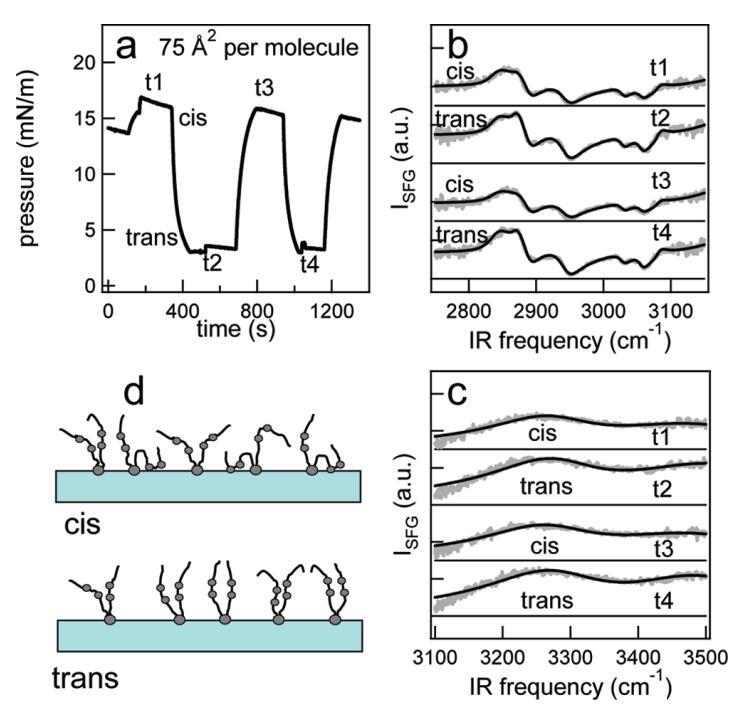 圖4:(a)在每分子75?2的面積處,脂質(zhì)/H2O界面處的光開關(guān)脂質(zhì)的表面壓力作為時(shí)間的函數(shù)。370和450 nm光照射~100秒分別產(chǎn)生cis(高壓)和trans(低壓)狀態(tài)。壓力的微小劇烈波動是由于樣品高度的變化,以校正水的蒸發(fā)。(b和c)CH和OH區(qū)域(灰色)中相應(yīng)的VSFG光譜,以及洛倫茲線形狀模型的擬合(見正文)。為了清晰起見,對光譜進(jìn)行了偏移。t1至t4對應(yīng)于面板a中進(jìn)行光譜測量的時(shí)間。(d)脂質(zhì)尾部方向示意圖。光開關(guān)脂質(zhì)的偶氮苯部分用灰色圓圈表示。