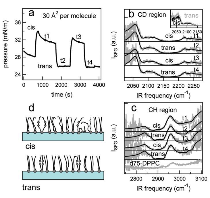 圖7:。結(jié)果:對于1:5的DT Azo-5P/d75 DPPC混合物,在脂質(zhì)/水界面上,每個(gè)分子的面積為30?2。(a)表面壓力與時(shí)間的關(guān)系。370和450 nm光照射~100秒分別產(chǎn)生cis(高壓)和trans(低壓)狀態(tài)。壓力的微小劇烈波動是由于樣品高度的變化,以校正水的蒸發(fā)。順式狀態(tài)下表面壓力的降低可能是由于單層的松弛或膠束或囊泡的形成減少了表面的脂質(zhì)量。(b)相應(yīng)的VSFG光譜(灰色)以及CD區(qū)域的擬合。為了清晰起見,對光譜進(jìn)行了偏移。插圖顯示了相互重疊的反式和順式光譜,以強(qiáng)調(diào)差異。(c)VSFG光譜(灰色)與fits一起引導(dǎo)眼睛進(jìn)入CH區(qū)域。底部曲線顯示了P下純d75 DPPC的光譜~40 mN/m.(d)脂尾方向示意圖。光開關(guān)脂質(zhì)的偶氮苯部分用灰色圓圈表示。