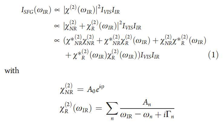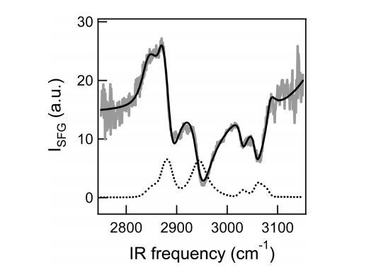 圖3:。在密度為75?2/分子和壓力為~3 mN/m。共振信號疊加在大型非共振背景上,由于共振信號和非共振信號之間的干擾,導(dǎo)致色散線型。黑色虛線表示NR振幅設(shè)置為零時(shí)的DT Azo-5P信號。