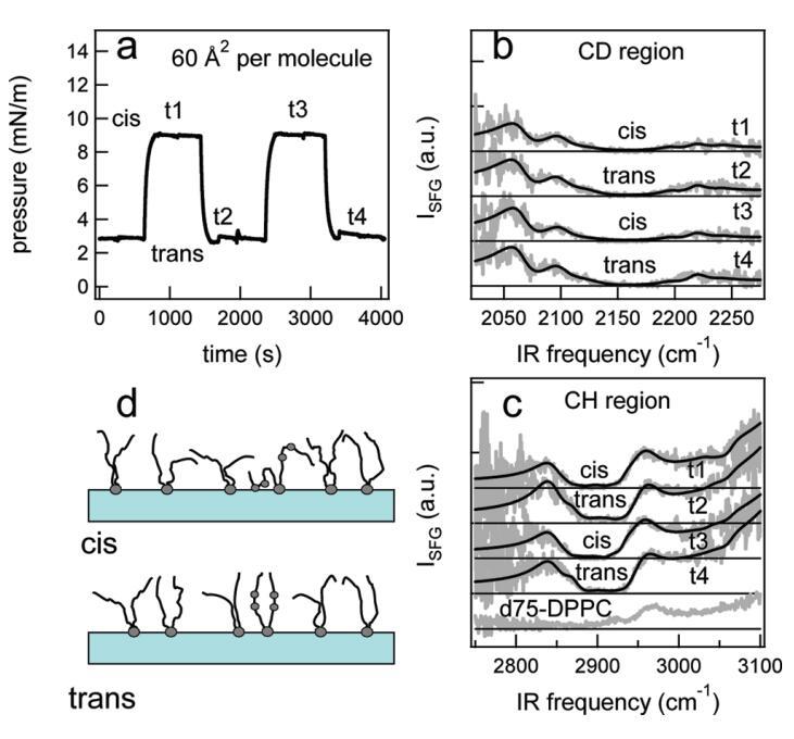 圖6:結(jié)果:DT Azo-5P/d75 DPPC的1:5混合物在脂質(zhì)/水界面上的面積為60?2/分子。(a)表面壓力與時(shí)間的關(guān)系。370和450 nm光照射~100秒分別產(chǎn)生cis(高壓)和trans(低壓)狀態(tài)。壓力的微小劇烈波動是由于樣品高度的變化,以校正水的蒸發(fā)。(b)相應(yīng)的VSFG光譜(灰色)以及CD區(qū)域的擬合。為了清晰起見,對光譜進(jìn)行了偏移。(c)VSFG光譜(灰色)與fits一起引導(dǎo)眼睛進(jìn)入CH區(qū)域。底部曲線顯示了P下純d75 DPPC的光譜~40 mN/m.(d)脂尾方向示意圖。光開關(guān)脂質(zhì)的偶氮苯部分用灰色圓圈表示。