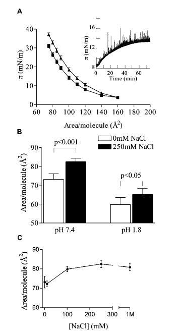 圖1:。NaCl對PIP2單分子膜的擴張效應(yīng)。(A)π-含0 mM(9)和250 mM NaCl(2)的等溫線;(插圖)亞相注入250 mM NaCl(時間)0時,恒定面積/分子的表面壓力變化。(B)在pH 1.8(n)7)和pH 7.4(n)5)條件下,30 mN/m的每個分子的面積。(C)對亞相NaCl的劑量反應(yīng)。誤差條為平均值(n處為SE)5,除非另有說明。所有數(shù)據(jù)均為HEPES緩沖亞相的L-R PIP2,pH 7.4(除非另有說明),30°C。