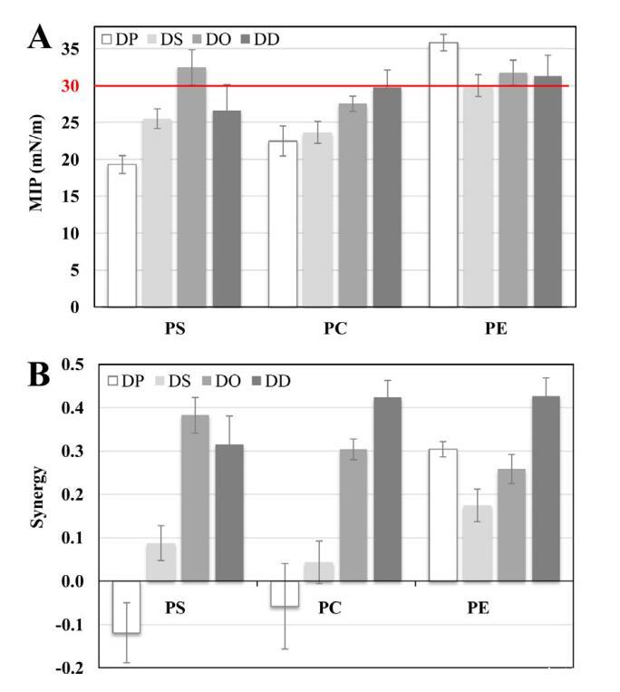 圖3.在鈣存在下,使用DPP、DSP、DOPS、DDPS、DPPC、DSPC、DOPC、DDC、DDPC、DPPE、DSPE、DOPE、DOPE和DDPE單層的mNCS1的MIP(A)和協(xié)同(B)值。MIP和synergy值的不確定性如第2.3節(jié)所述計(jì)算。