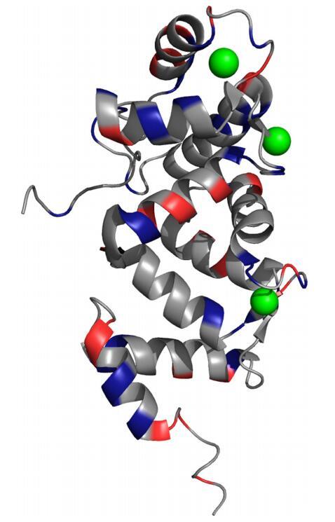 圖4.nmNCS1結(jié)構(gòu)上的正(紅色)和負(fù)(藍(lán)色)電荷(PDB 2LCP)[23](關(guān)于此圖例中顏色的說明,讀者請參閱本文的web版本)。
