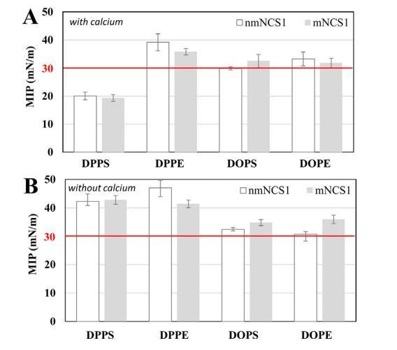 圖7比較了有無鈣時mNCS1和nmNCS1的MIP值(數(shù)值見表S6)。在PC或PE脂質(zhì)單分子膜存在下觀察到的所有MIP值均高于30 mN/m,表明肽可以優(yōu)先結(jié)合由兩性極性頭基組成的磷脂。所有這些MIP值相似(31.6和37.7 mN/m之間,DOPE除外),并且沒有顯示出對特定脂肪?;湹拿鞔_偏好。在PS脂質(zhì)單分子膜存在下觀察到的MIP值低于30 mN/m,但DOP除外,這可以由DO脂肪?;湹莫毺貥?gòu)象來解釋。此外,在存在DP、DS和DD脂肪酰基鏈的情況下,PE脂質(zhì)單分子膜的協(xié)同值高于PC和PS脂質(zhì)單分子膜的協(xié)同值。在DS脂肪?;湹那闆r下,用PE脂質(zhì)單層觀察到的協(xié)同值低于用PC觀察到的協(xié)同值,但優(yōu)于用PS觀察到的協(xié)同值。這些趨勢表明,N端肽參與了整個蛋白質(zhì)與由PE脂質(zhì)單層組成的磷脂的優(yōu)先結(jié)合。此外,關(guān)于脂肪?;?,沒有明顯的趨勢。事實上,在不飽和磷脂與聚苯乙烯的存在下觀察到更高的協(xié)同值,而在聚碳酸酯中觀察到相反的趨勢。除DOPE外,在PE中觀察到的所有協(xié)同值都很高。因此,這些數(shù)據(jù)表明,除了其N末端片段外,蛋白質(zhì)的其他結(jié)構(gòu)域也參與了膜結(jié)合。此外,在DOPE、DOPS和DPPE存在的情況下,計算了N端肽的速率系數(shù)(表S3)。速率系數(shù)比完整蛋白質(zhì)慢并且相對恒定(0.001 s?1,0.002秒?1和0.003秒?1分別為DOPE、DOPS和DPPE單層)。這一結(jié)果表明,NCS1的其他結(jié)構(gòu)域參與了蛋白質(zhì)與脂質(zhì)單層的相互作用速度。