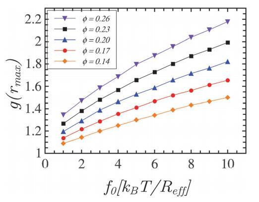 圖7顯示了面積分數(shù)的五個代表值的g(rmax)作為f0的函數(shù),單位為kBT/Reff。