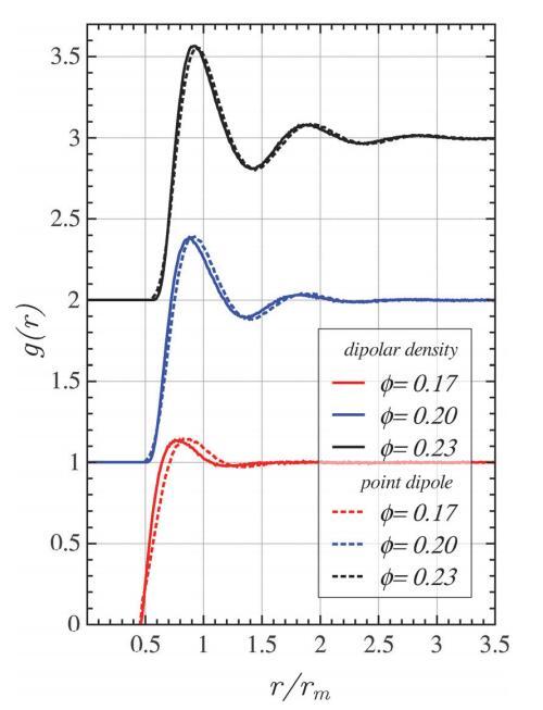 在第一個峰值位置和g(r)開始偏離零的小區(qū)域觀察到輕微差異。當系統(tǒng)更加結構化時,協(xié)議會得到改善。特別是,對于弱相互作用域,差異開始明顯。這些偏差是由于點偶極力在接觸時趨于有限值,而在偶極密度情況下,它會發(fā)散。因此,硬盤相互作用與點偶極子模型有關。