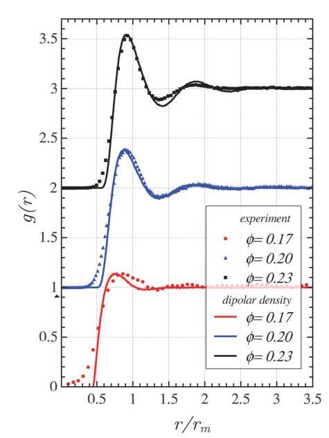 圖9使用偶極密度和點偶極相互作用從BD模擬中獲得的徑向分布函數(shù)。選擇點-偶極相互作用強度f p0,使偶極密度模型的相應g(rmax)與表2中的參數(shù)相匹配。當f=0.17、0.20和0.23時,得到的f p0值分別為3.0、6.6和8.2[kBT/Reff]。為了清晰起見,數(shù)據(jù)已垂直移動。