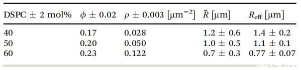 表1考慮的單分子膜的凝聚面積分數(shù)、數(shù)密度、平均半徑和有效半徑。誤差由標準差確定,但f除外,f是通過改變閾值確定的,如實驗部分所述