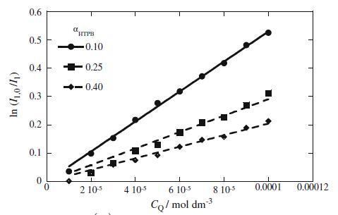 KSV值根據(jù)公式20(數(shù)據(jù)未顯示)的斜率進(jìn)行評估,如圖6所示。圖6顯示KSV的值隨著HTPB成分含量的增加而降低,反映出熒光團(tuán)變得更難接近猝滅劑。據(jù)報道,隨著陽離子gemini表面活性劑摩爾組成的增加,KSV降低[24]。