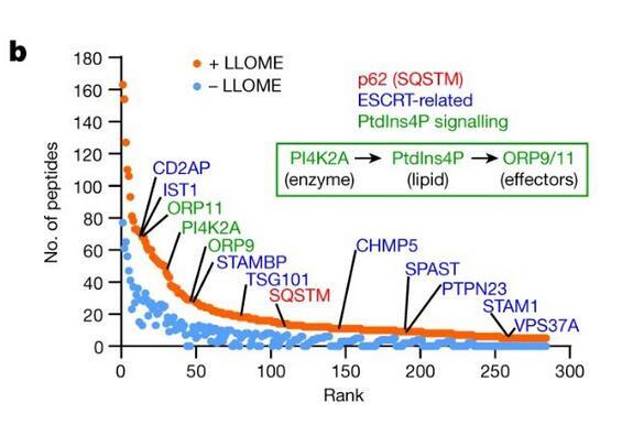 首先,研究者用生物素對溶酶體表面的所有蛋白進行了標記,然后通過組學(xué)方法來尋找溶酶體受損后,表面特異性富集的蛋白。此研究發(fā)現(xiàn),溶酶體一旦受損,在短短幾分鐘后,一種叫PI4K2A的激酶就會到達現(xiàn)場,隨后導(dǎo)致脂質(zhì)信號PI4P(磷脂酰肌醇4-磷酸)大量富集于溶酶體表面。