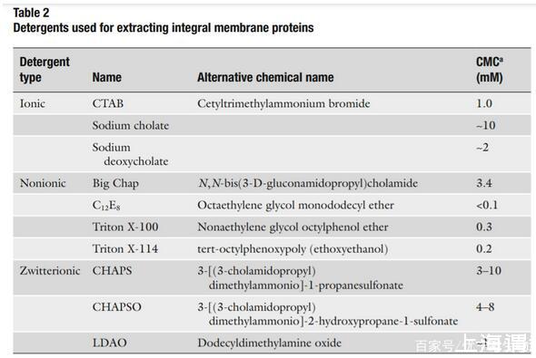 當(dāng)篩選去垢劑時,要注意每個去垢劑的臨界膠束濃度(CMC)。CMC是指自由的去垢劑分子形成膠束結(jié)構(gòu)需要的濃度。因為溶液相當(dāng)于膜蛋白從細胞膜上去除進入去垢劑膠束,所以CMC是蛋白提取所需的最低濃度。CMC值可參考表二。
