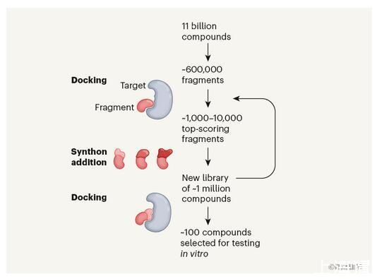 通過重復(fù)對接和添加合成子的步驟,篩選幾百萬個(gè)化合物來確定hits。隨著每一次迭代,每個(gè)化合物的大小都會隨著分子變得更加完整而增加。