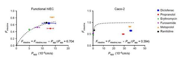 隨后,研究分析了各種腸道轉(zhuǎn)運體和代謝酶的表達水平,通過RNA測序與酶活性檢測,發(fā)現(xiàn)腸道堿性磷酸酶(IAP)和CYP3A4在功能性hIEC中表達量相當高,這些結(jié)果表明功能性hIEC具有藥物轉(zhuǎn)運體和藥物代謝酶活性,是評價藥物體外生物利用度所必需的。本研究使用了6種臨床藥物:美托洛爾、普萘洛爾、雙氯芬酸、雷尼替丁、呋塞米和紅霉素,進行體外藥物吸收試驗,發(fā)現(xiàn)與Caco-2模型不理想的體內(nèi)外相關(guān)性相比,功能性hIEC與已公布的人體內(nèi)腸道吸收數(shù)據(jù)擬合的相關(guān)性良好,說明功能性hIEC可以更好地預(yù)測人的口服生物利用度和吸收程度。