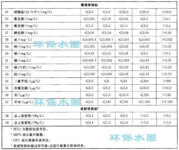 依據(jù)我國地下水質量狀況和人體健康風險,參照生活飲用水、工業(yè)、農(nóng)業(yè)等用水質量要求,依據(jù)各組分含量高低(pH除外),分為五類。