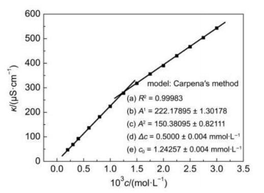 測量原理:利用電導率測定儀測量不同濃度表面活性劑水溶液的電導值(也可換算成摩爾電導率)。對于離子型表面活性劑,當溶液濃度很稀時,電導的變化規(guī)律與一般強電解質相似,表面活性劑完全解離為離子,隨著濃度上升,電導率K近乎線性上升但當溶液濃度達到臨界膠束濃度時,隨著膠束的形成,膠束定向移動速率減緩,K仍隨著濃度增大而上升,但變化幅度變小。摩爾電導率λm也急劇下降,利用K-C曲線的轉折點求CMC值(圖4所示)。