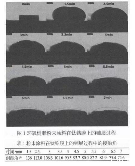 楊雲(yún)予等人利用接觸角測量儀在恒溫180℃下,拍出了不同時刻圓柱狀粉末涂料在鋁合金鈦鋯膜上的熔融和鋪展過程圖,并記錄了的潤濕角,為研究粉末涂料固化過程中,凝膠前的接觸角變化提供了依據(jù)。